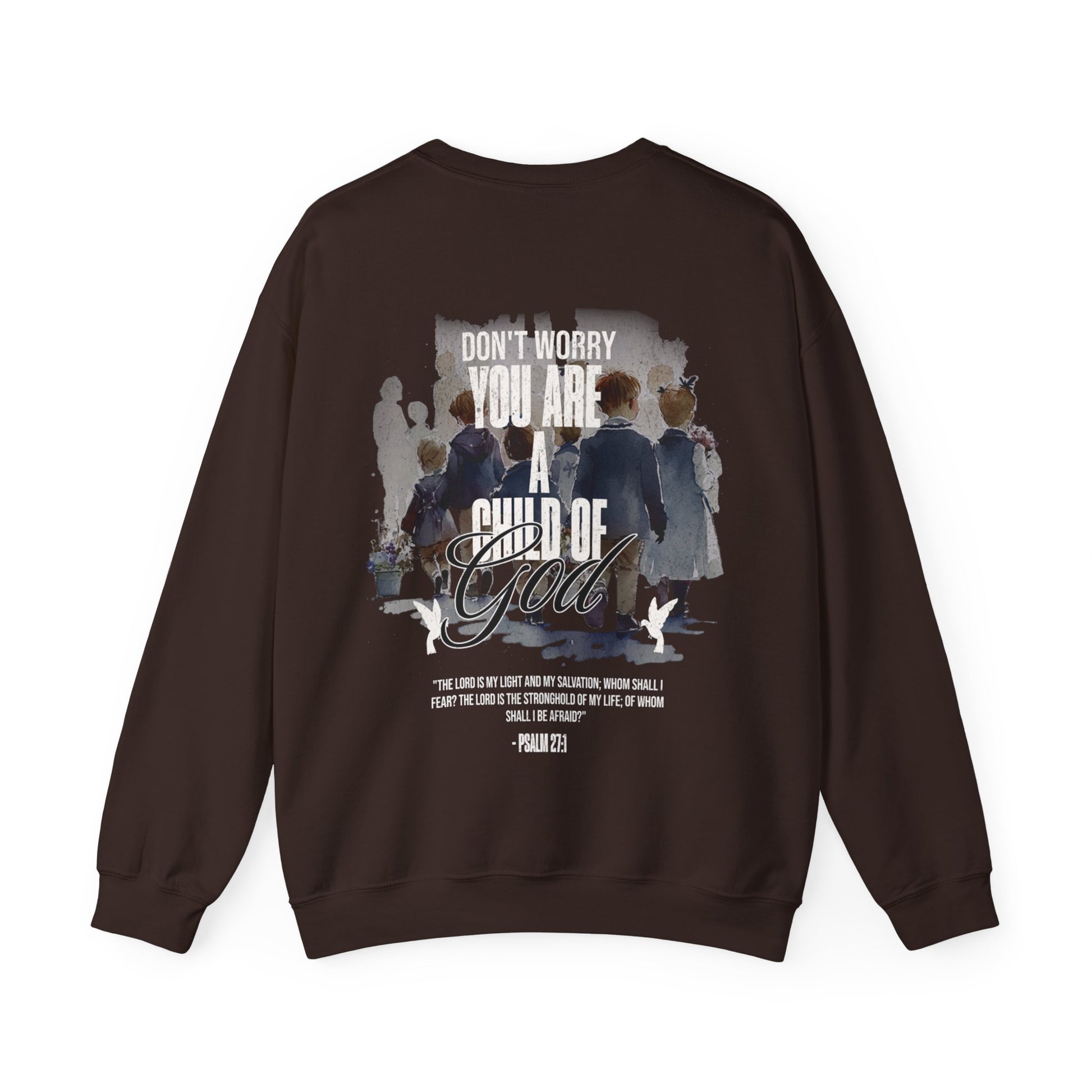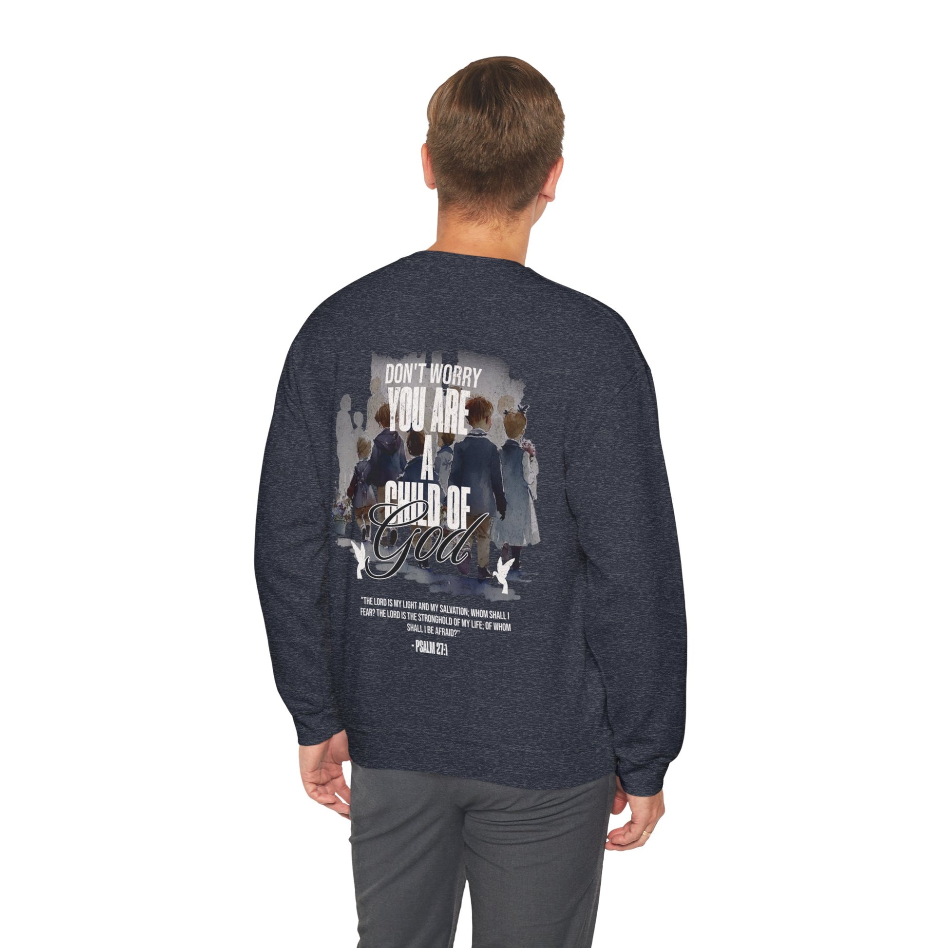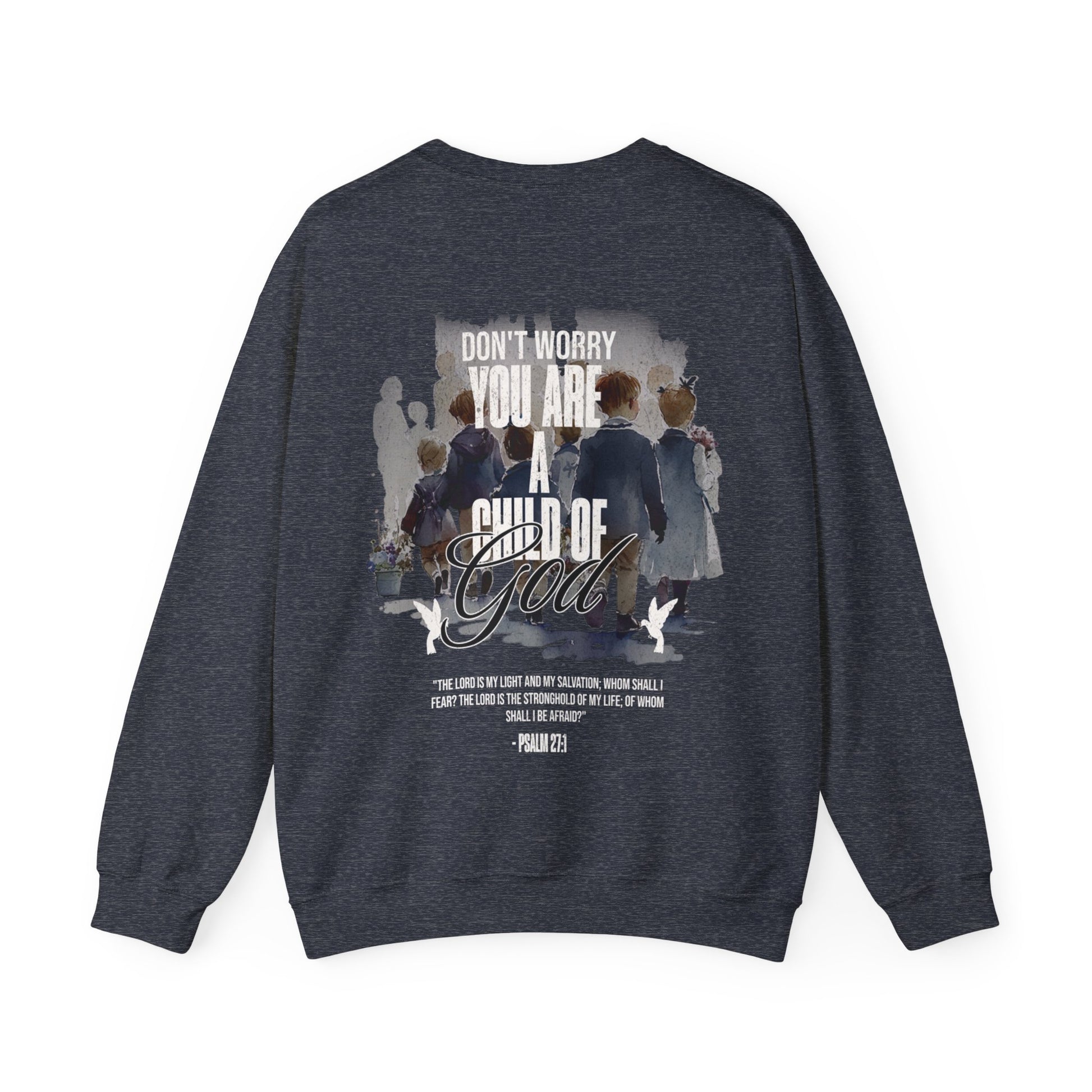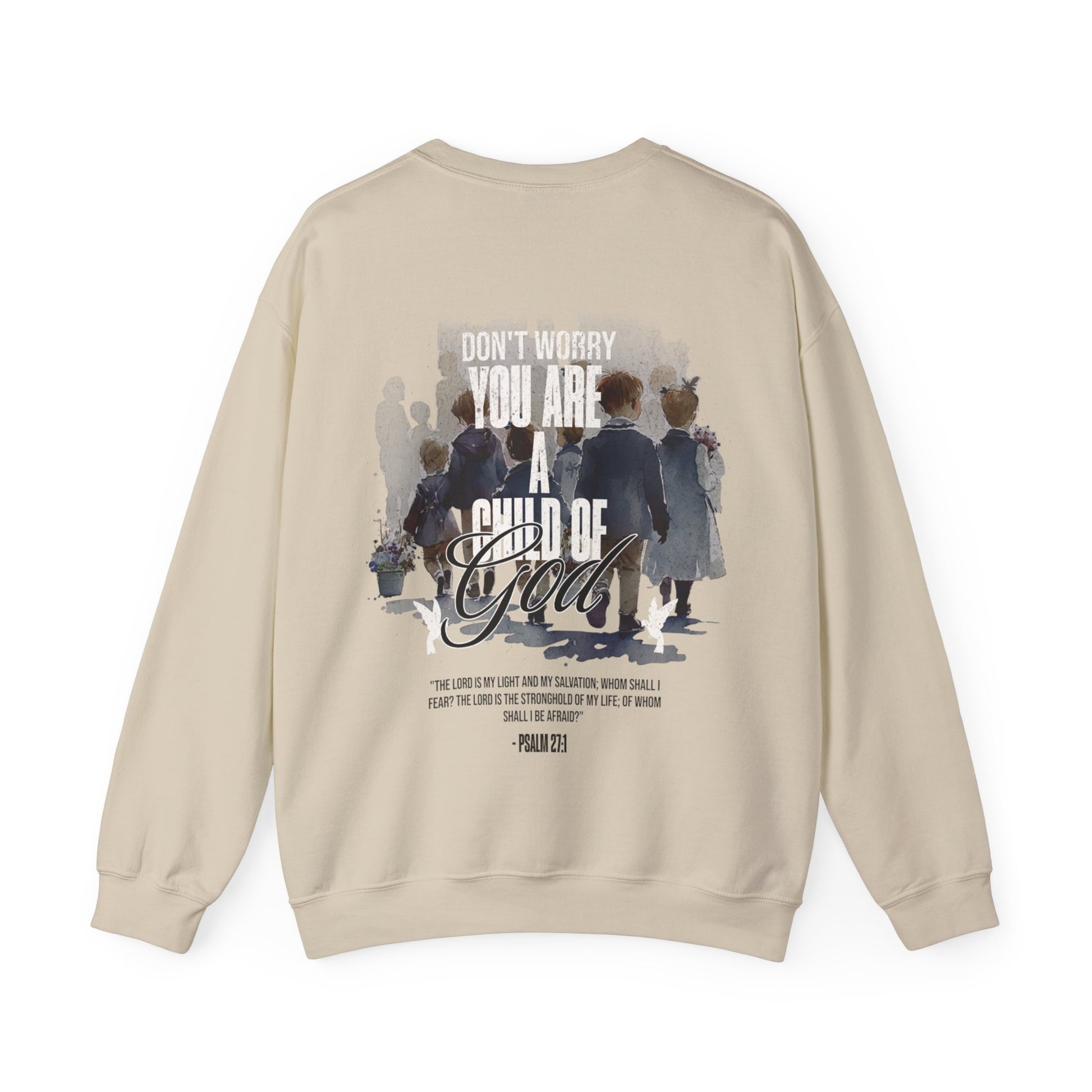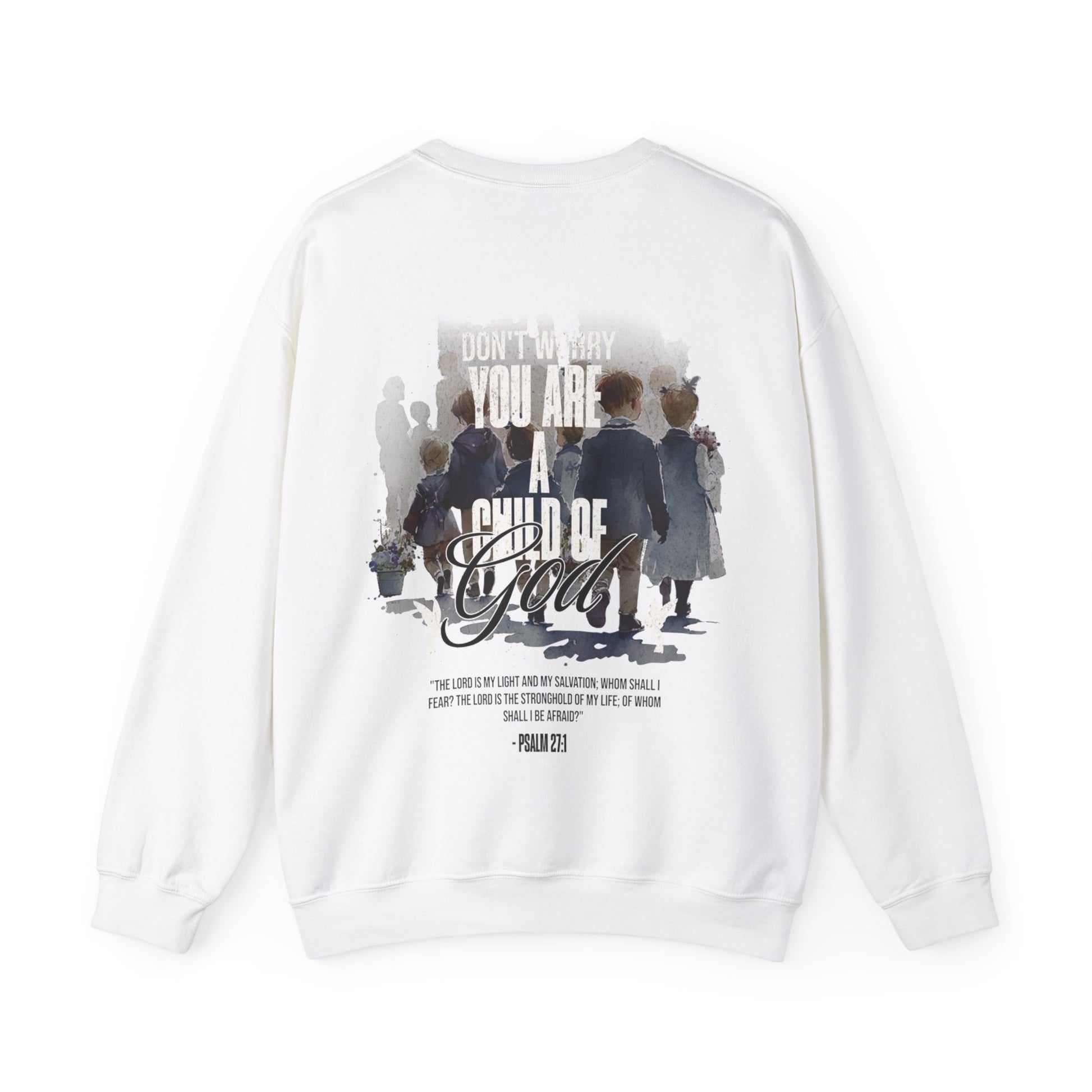 This "Child of God" crewneck is the perfect and stylish way to show the love of God. When you wear this crewneck you are reminding people and fellow believers that there is not reason to be afraid, for the Lord is our fortress our protector. Psalm 27:1