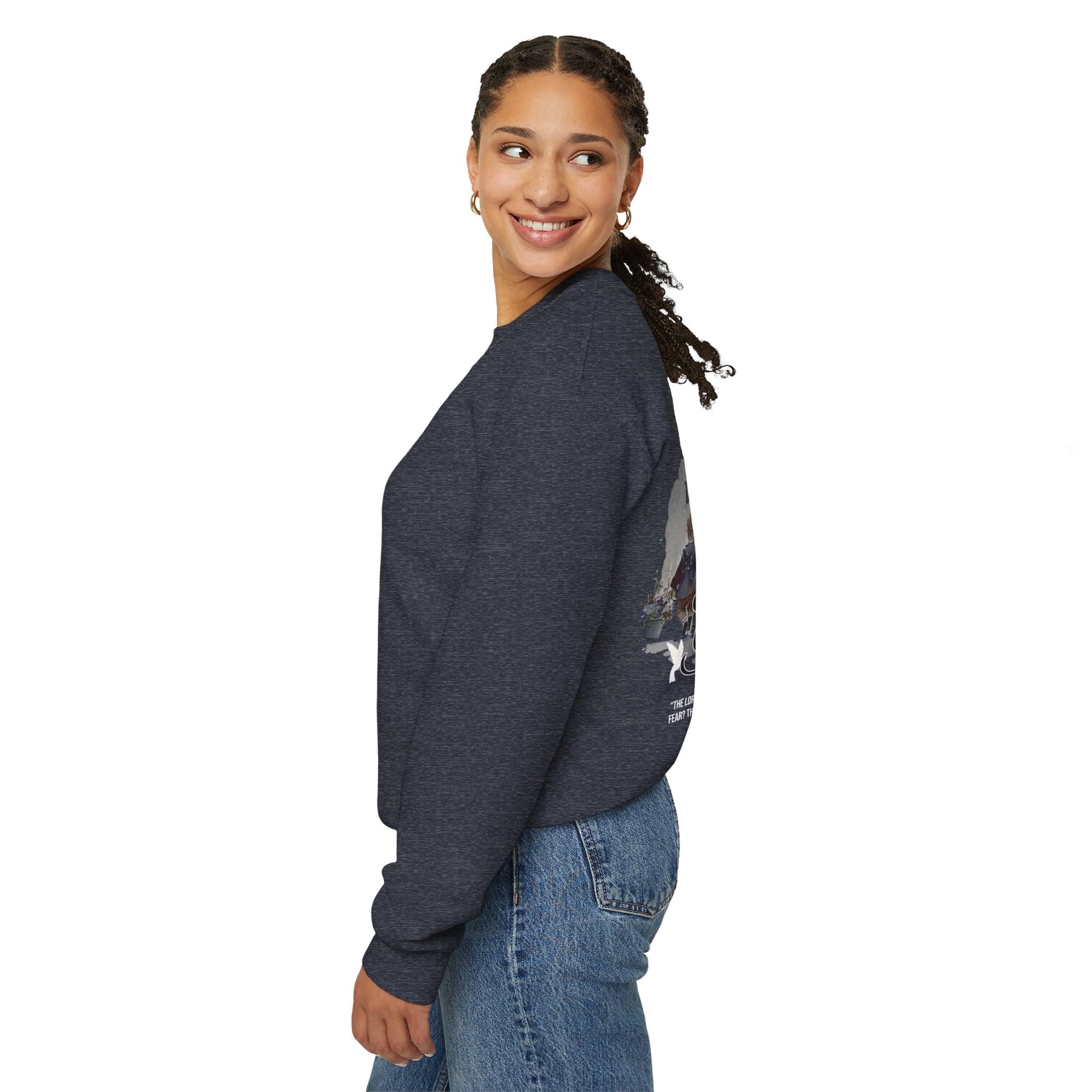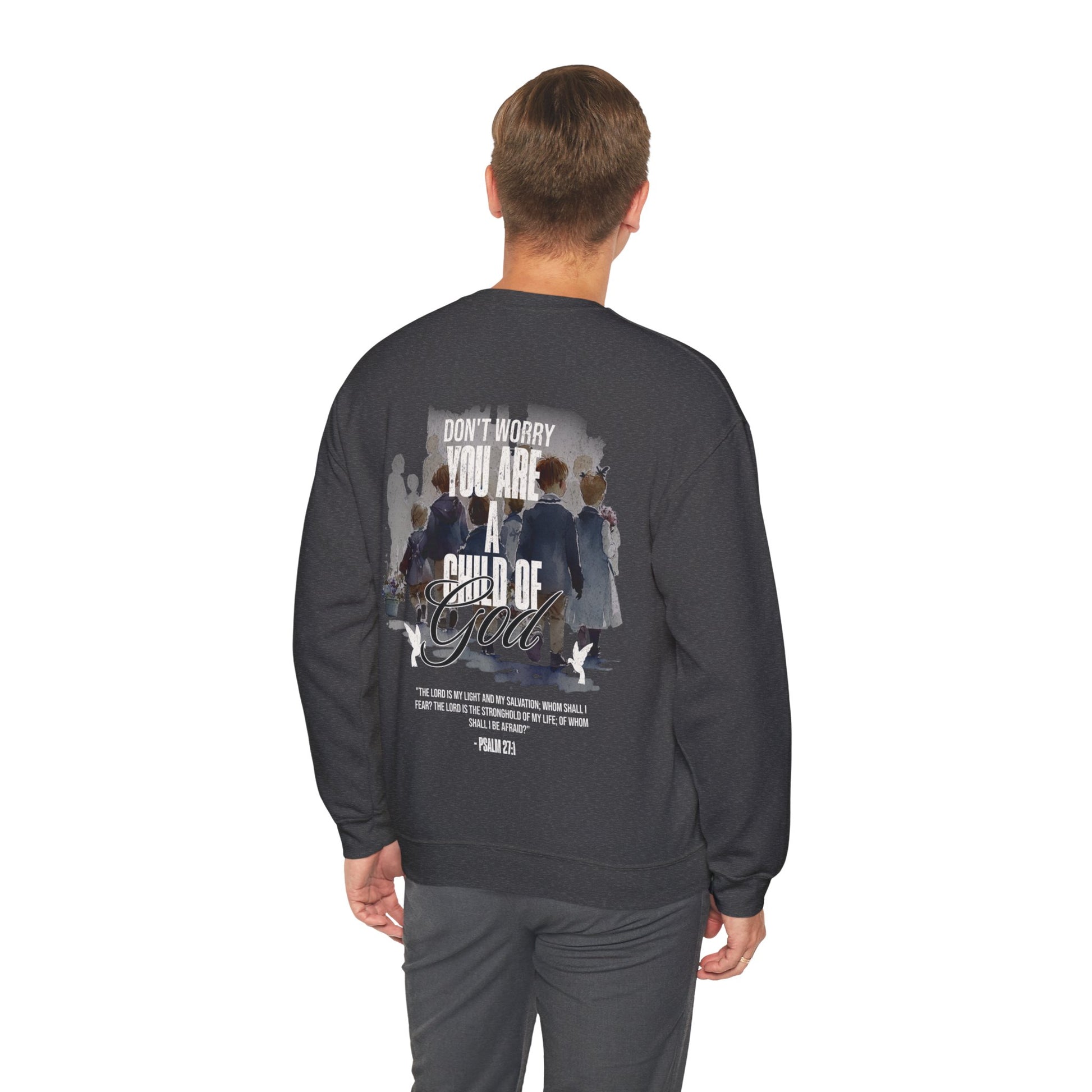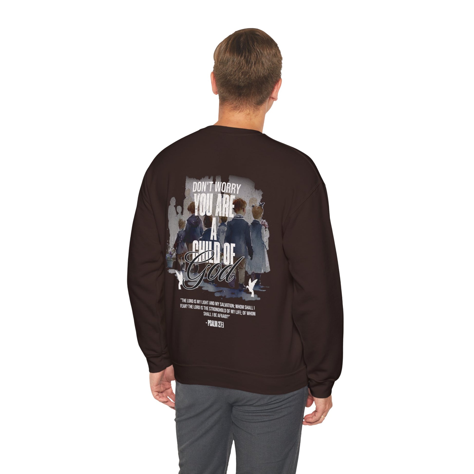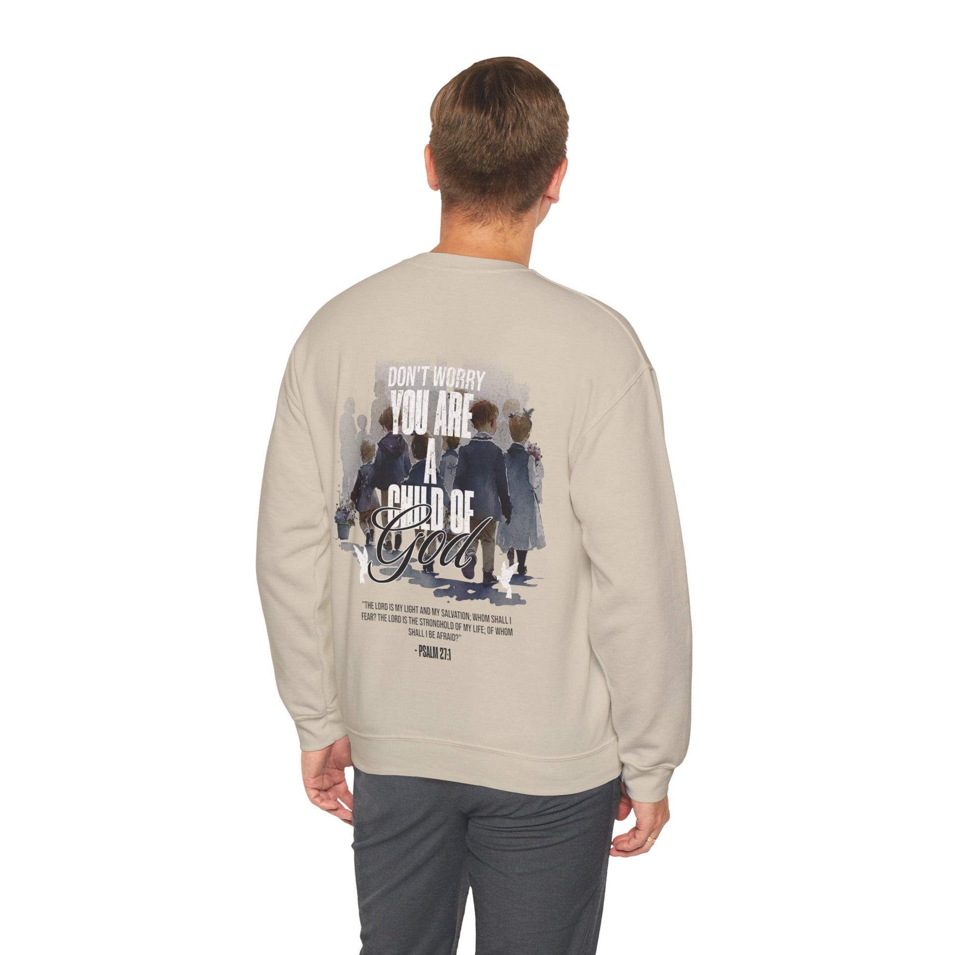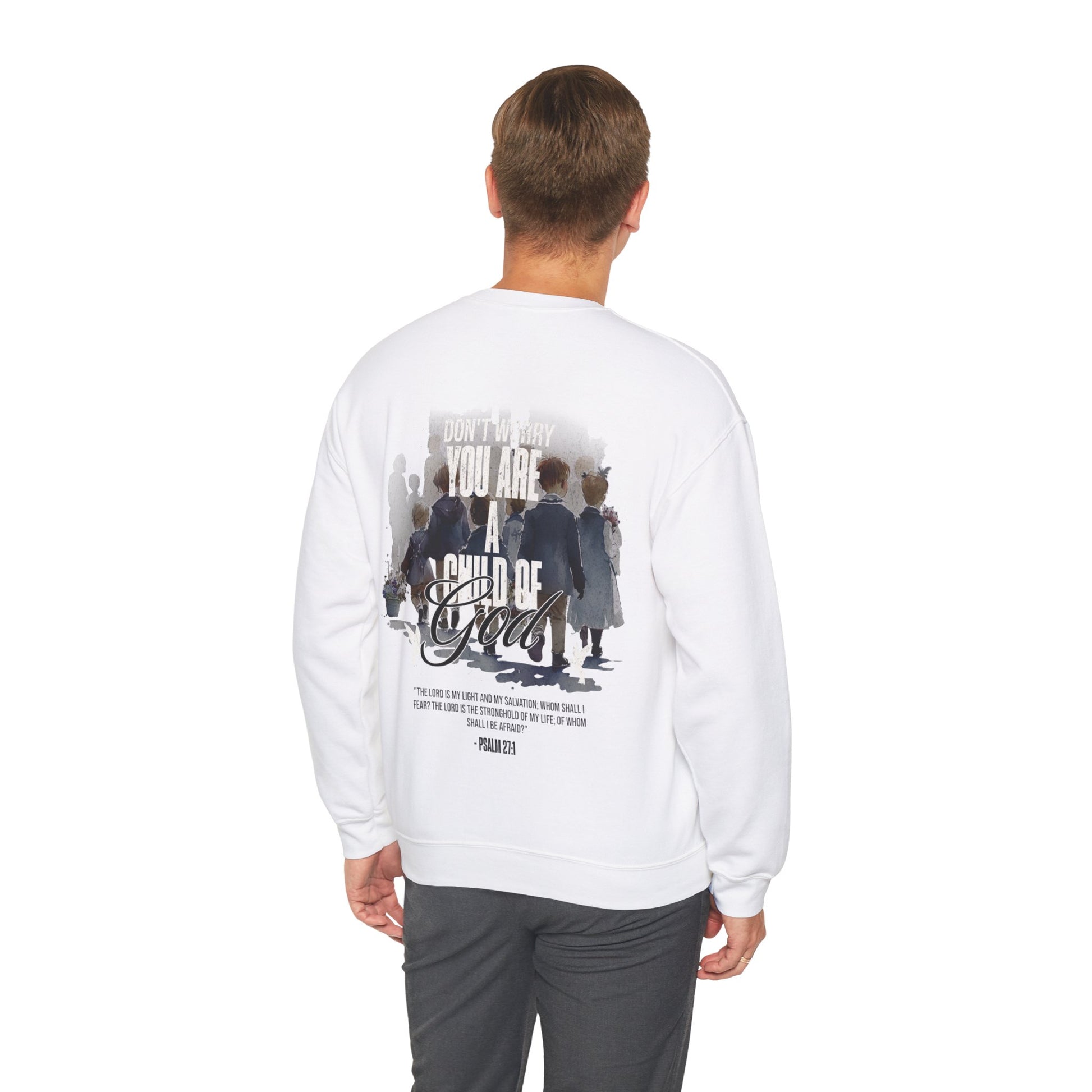 This "Child of God" crewneck is the perfect and stylish way to show the love of God. When you wear this crewneck you are reminding people and fellow believers that there is not reason to be afraid, for the Lord is our fortress our protector. Psalm 27:1