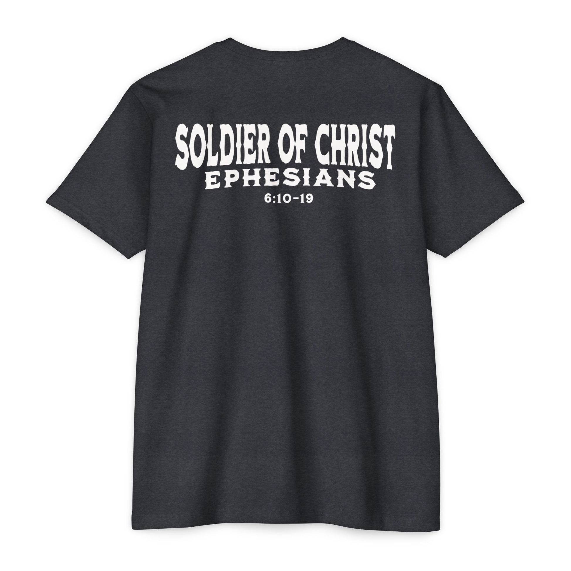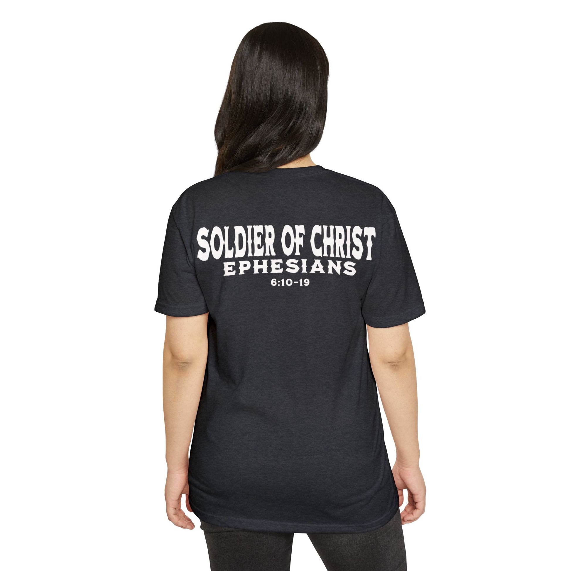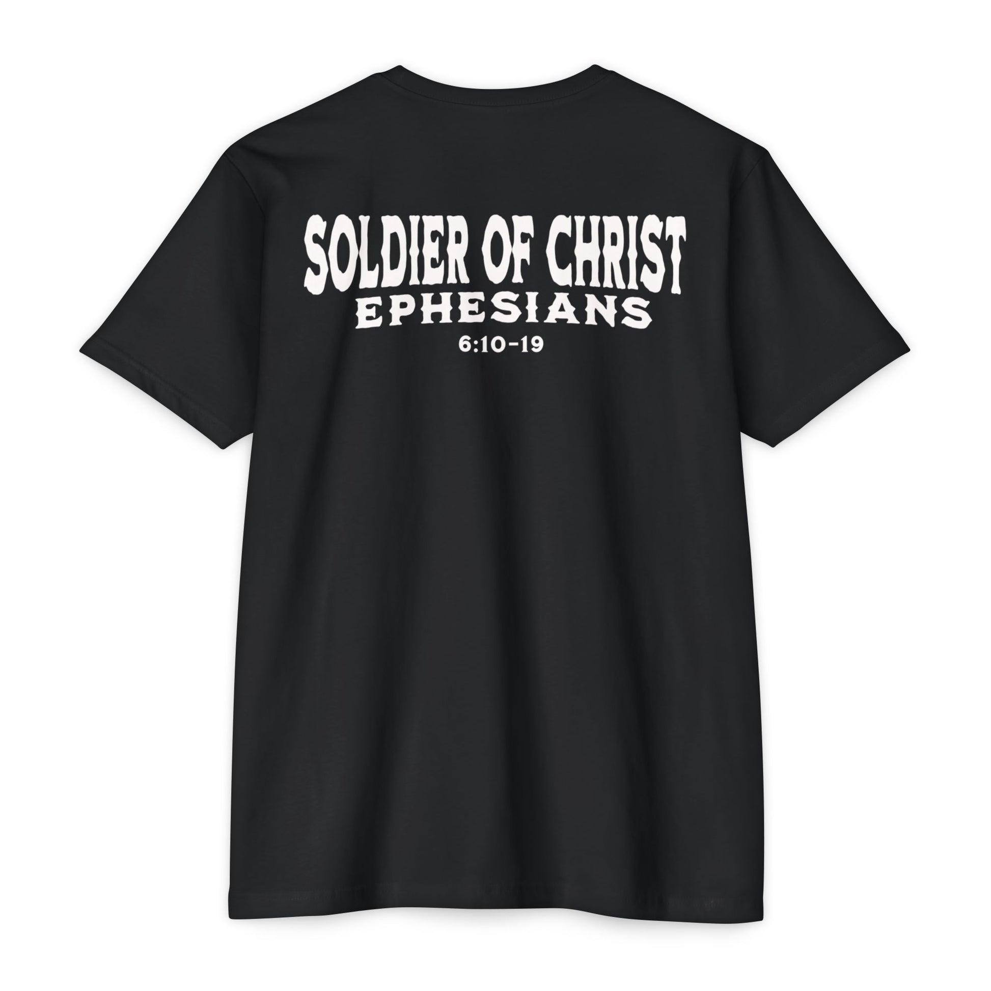 This T-shirt is a powerful statement of faith, showcasing a design representing believers as soldiers of Christ. When you wear this shirt, it shows the Living God in whom you stand for and represent. For Christ lives within us, and with Him all evil will back down in Jesus name.