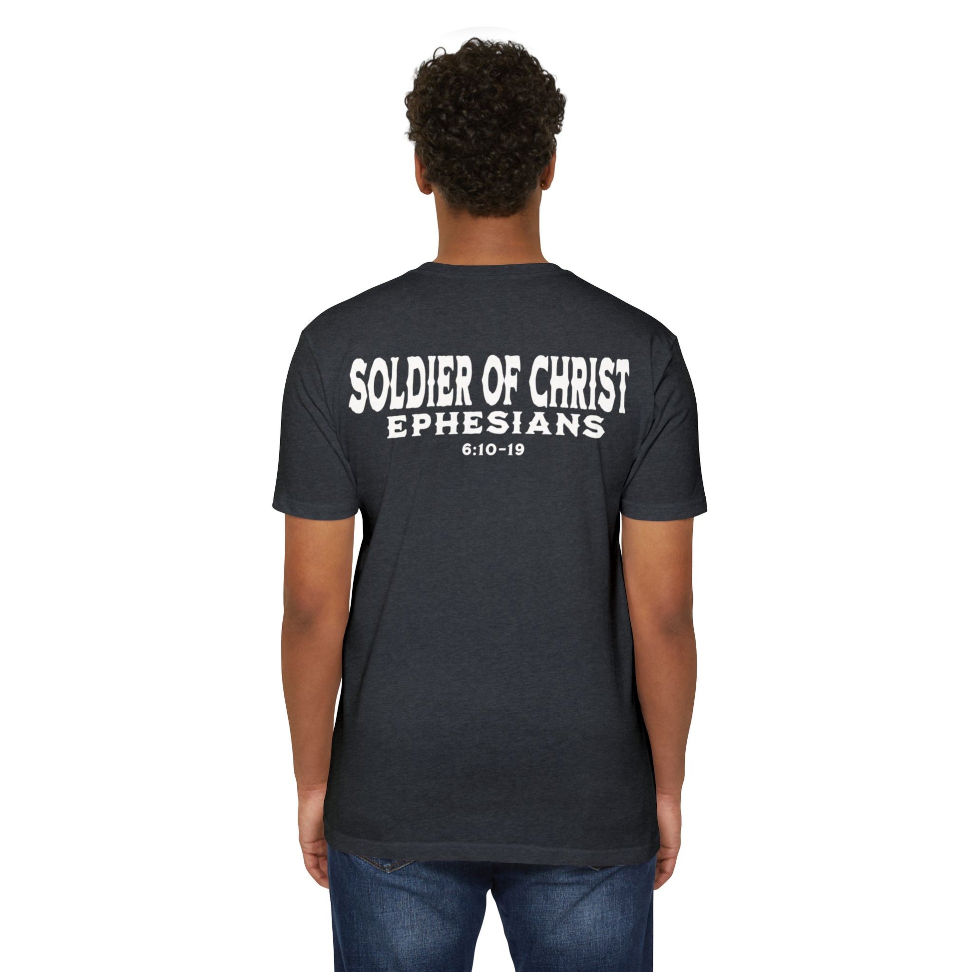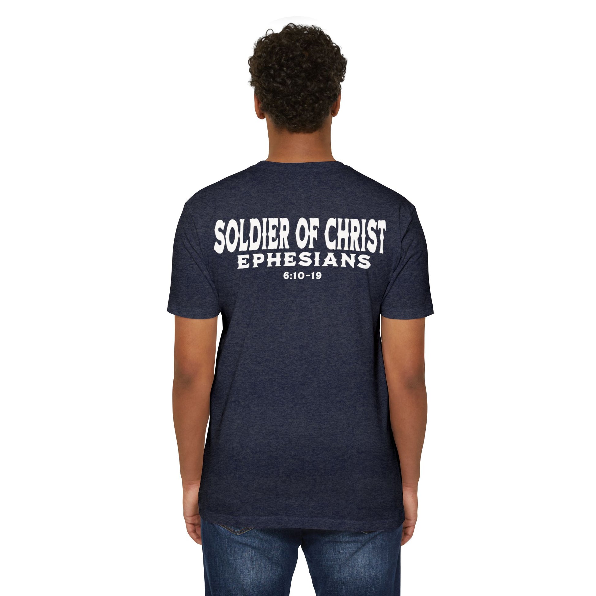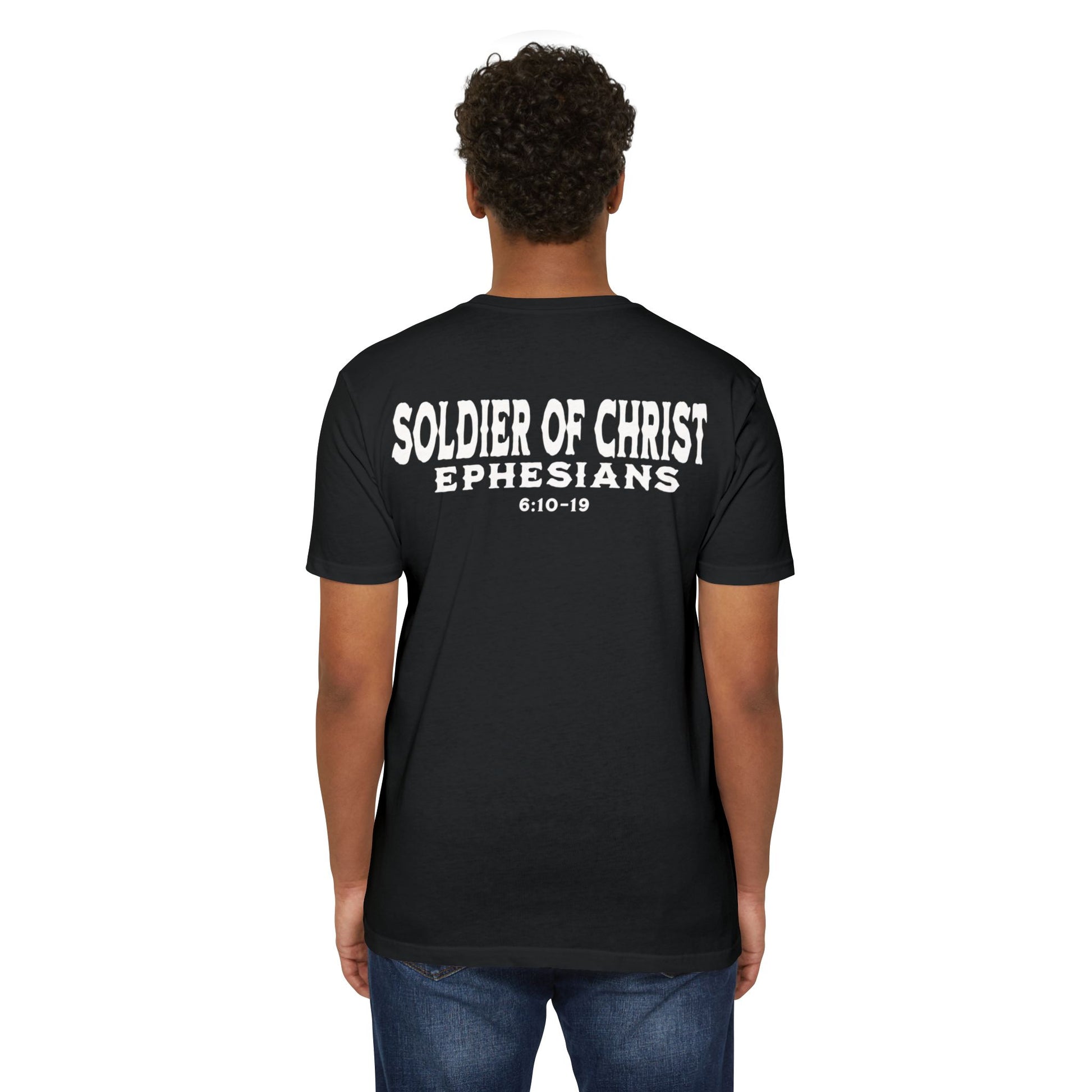 This T-shirt is a powerful statement of faith, showcasing a design representing believers as soldiers of Christ. When you wear this shirt, it shows the Living God in whom you stand for and represent. For Christ lives within us, and with Him all evil will back down in Jesus name.